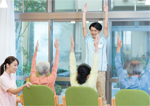 在宅復帰に向けて、利⽤者様一人一人に合った、リハビリ専門職によるリハビリテーションを提供し、自宅訪問や栄養・介護指導なども行っています。